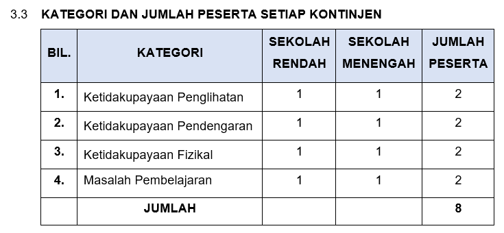 • MBPK yang memegang kad OKU berstatus MD akan mengikut ketidakupayaan major yang telah disahkan oleh pakar perubatan manakala pemegang kad OKU status SD akan bertanding bersama-sama MBPK kategori DE.